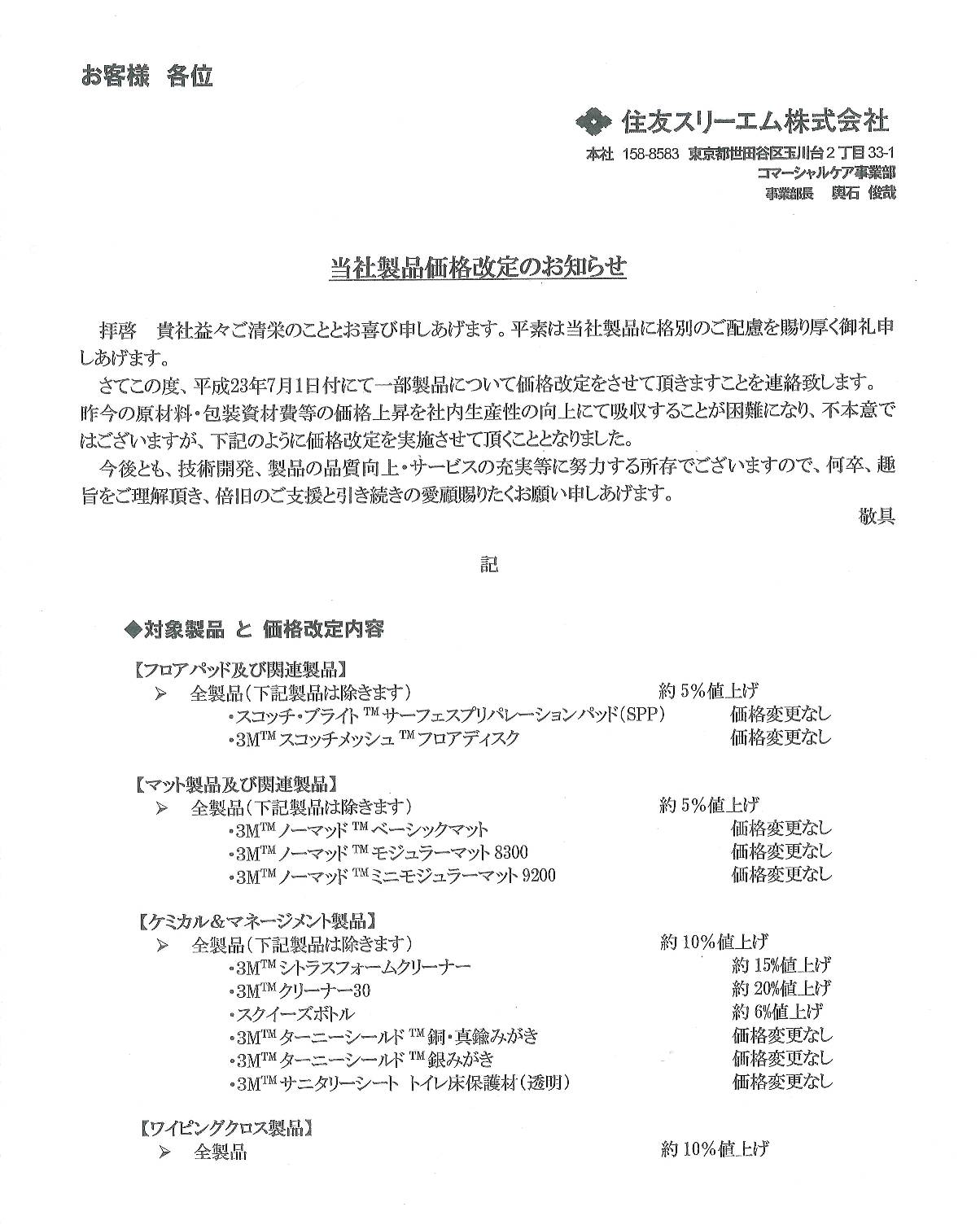 住友3M製品の一部価格改定のお知らせ。