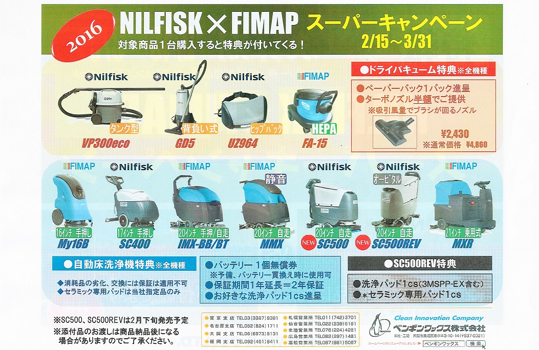 ペンギンワックス社が取扱うマシンメーカー「Nilfisk」社と「FIMAP」社 の商品を購入するとお得な特典が付いてきます。「Nilfisk」はデンマーク、「FIMAP」はイタリアに本社を置き、世界中で愛用されている歴史ある清掃機器メーカーです。是非、この機会にお試し下さい。