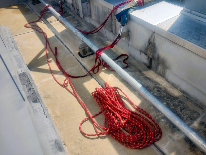 鳩のフンを除去するには、屋上からロープで降りてくるしかありません。